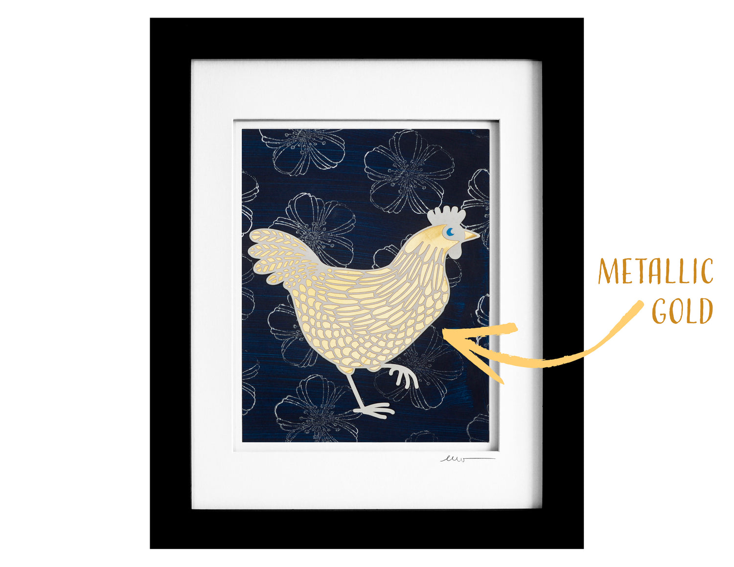 Discover the charm of our Chicken papercut set against a deep navy blue backdrop. This playful piece features a delicate metallic silver floral pattern that dances around a detailed chicken with shimmering metallic gold feathers. Perfect for adding a touch of whimsy and elegance to any space.