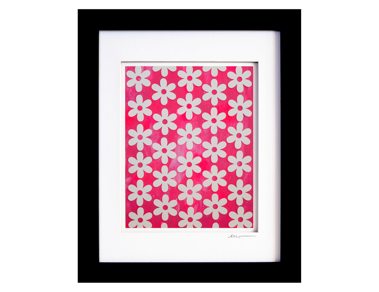 This vibrant artwork features an original papercut design with a bright pink hand-painted background, playfully accented by a lively pattern of crisp white daisies. Its cheerful colors and whimsical floral motif bring a fresh burst of joy to any space.
