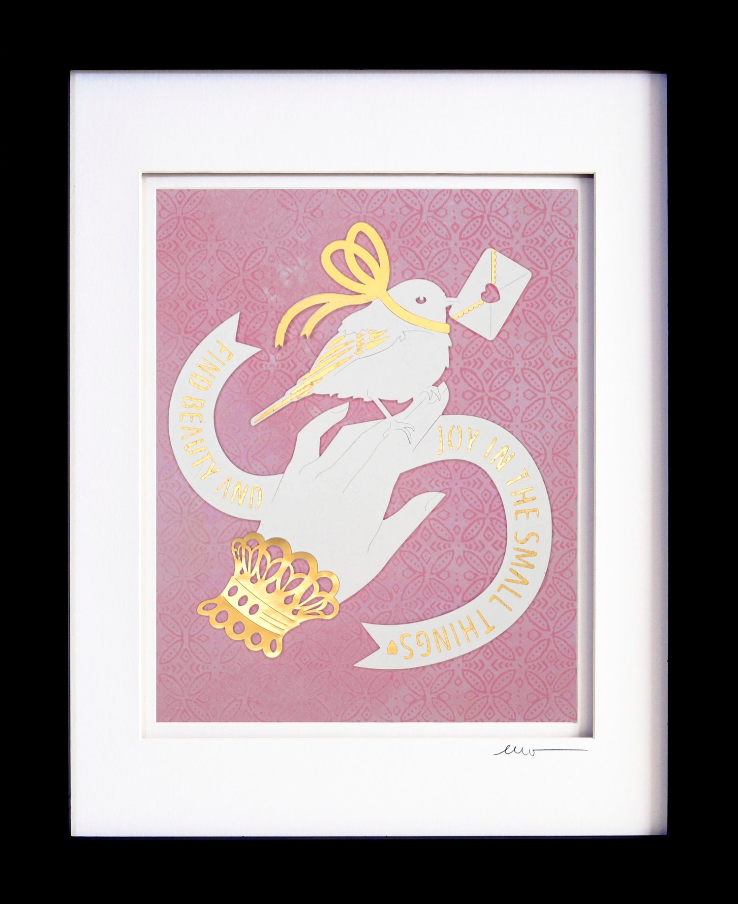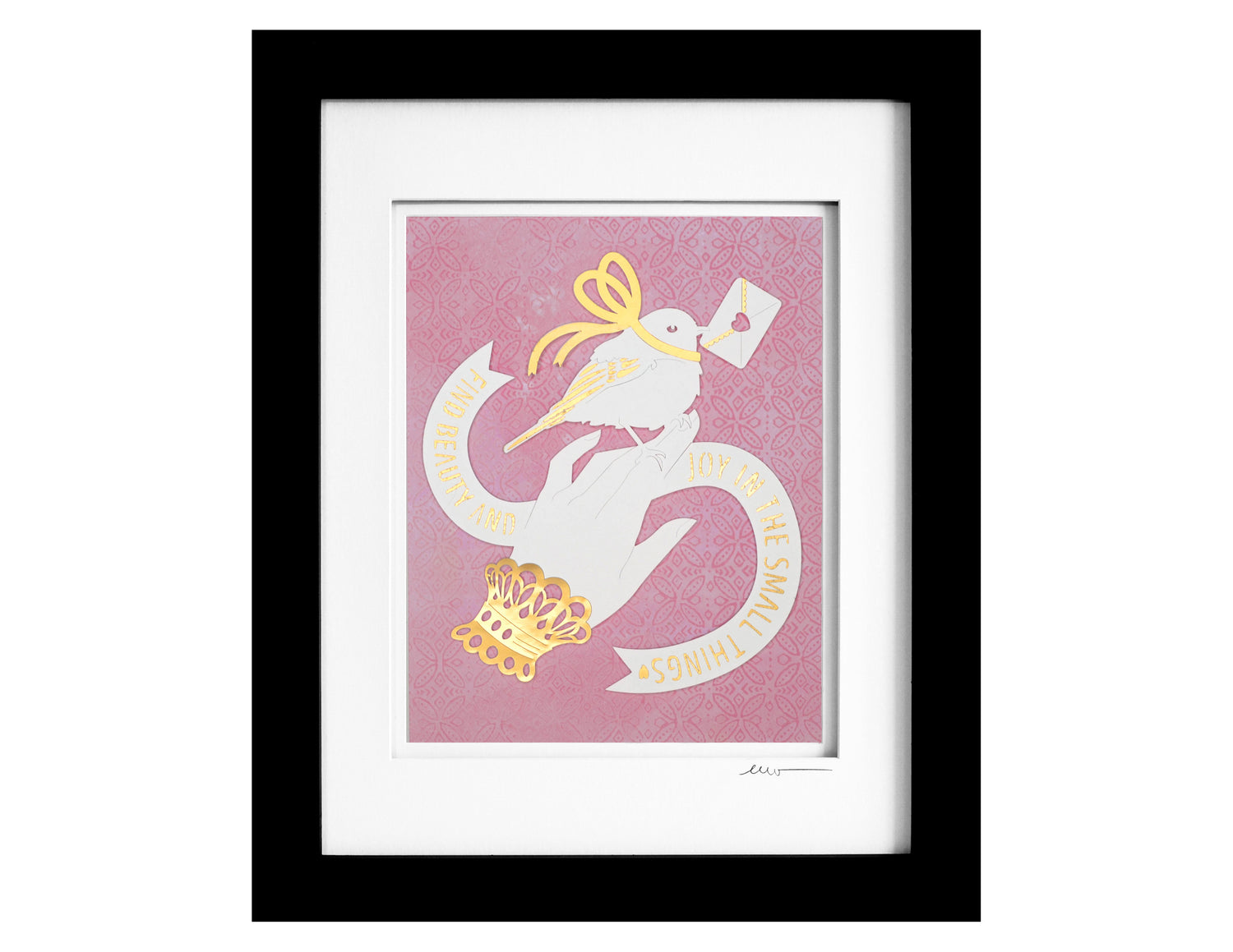 This charming artwork features an original papercut design set against a pink patterned background. Metallic gold accents highlight delicate ribbons and bows, adding a touch of sparkle. A tiny bird perches gently on a woman’s hand, clutching a miniature envelope sealed with a heart. Behind them, a whimsical banner reads “find joy and beauty in small things,” inviting a playful reminder to cherish life’s little moments.
