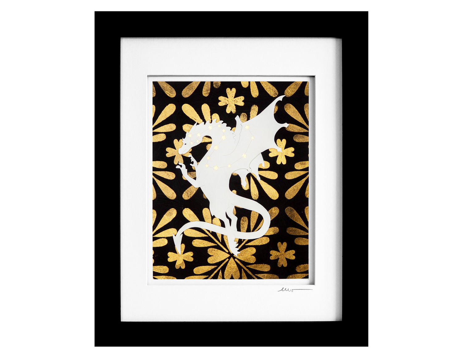 Celebrate mythical charm with this Dragon papercut. Featuring a metallic gold and black patterned background, the intricate dragon design is beautifully detailed with stars forming the Draco Constellation. Perfect for adding a touch of magic and brilliance to any space, this playful piece invites wonder and imagination.