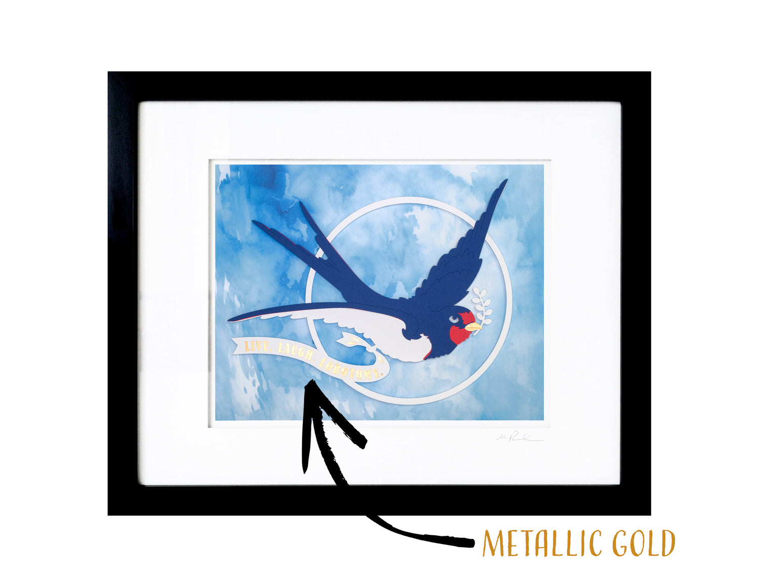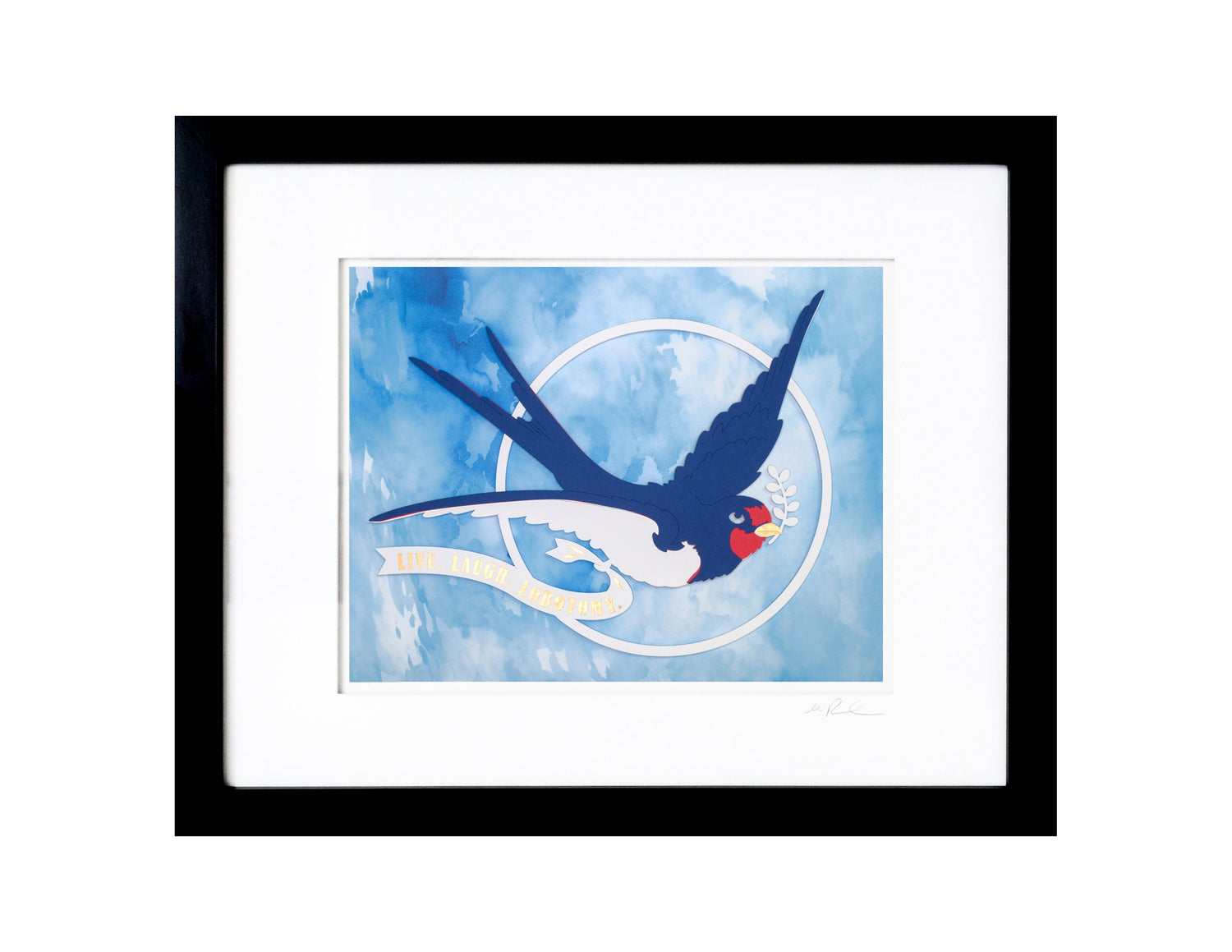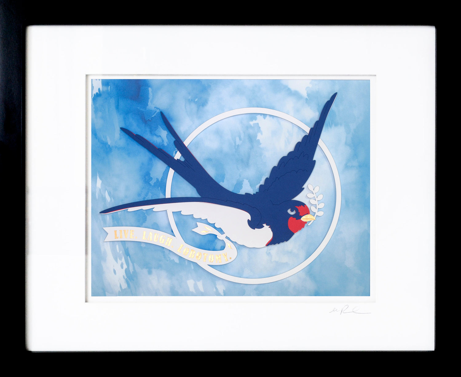 This original papercut brings a playful twist to vintage tattoo art with a charming sparrow design. The cheeky banner reading "live, laugh, lobotomy" adds a fun, unexpected edge, making it a delightful piece that sparks conversation and smiles. Perfect for those who appreciate quirky, bold art with a wink.