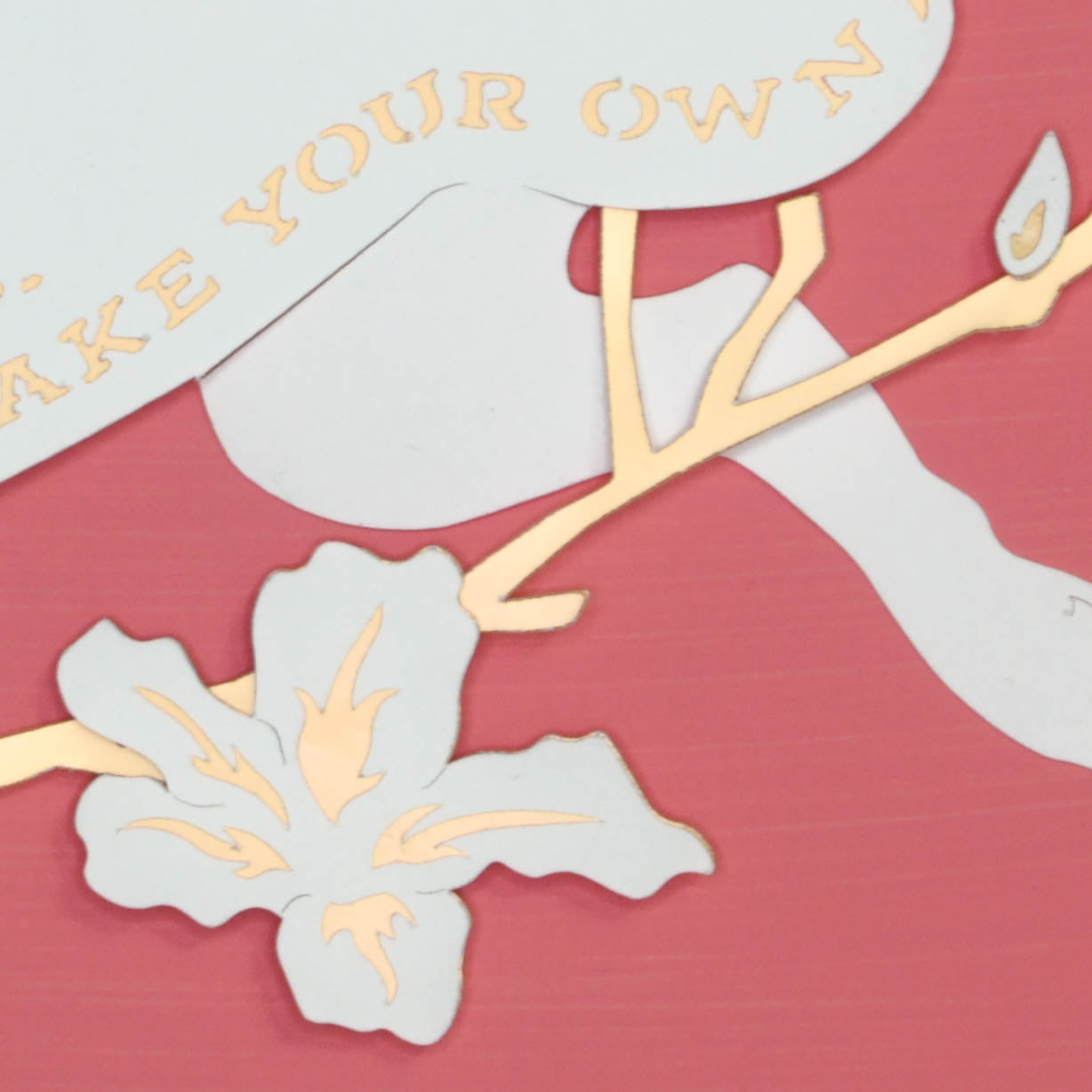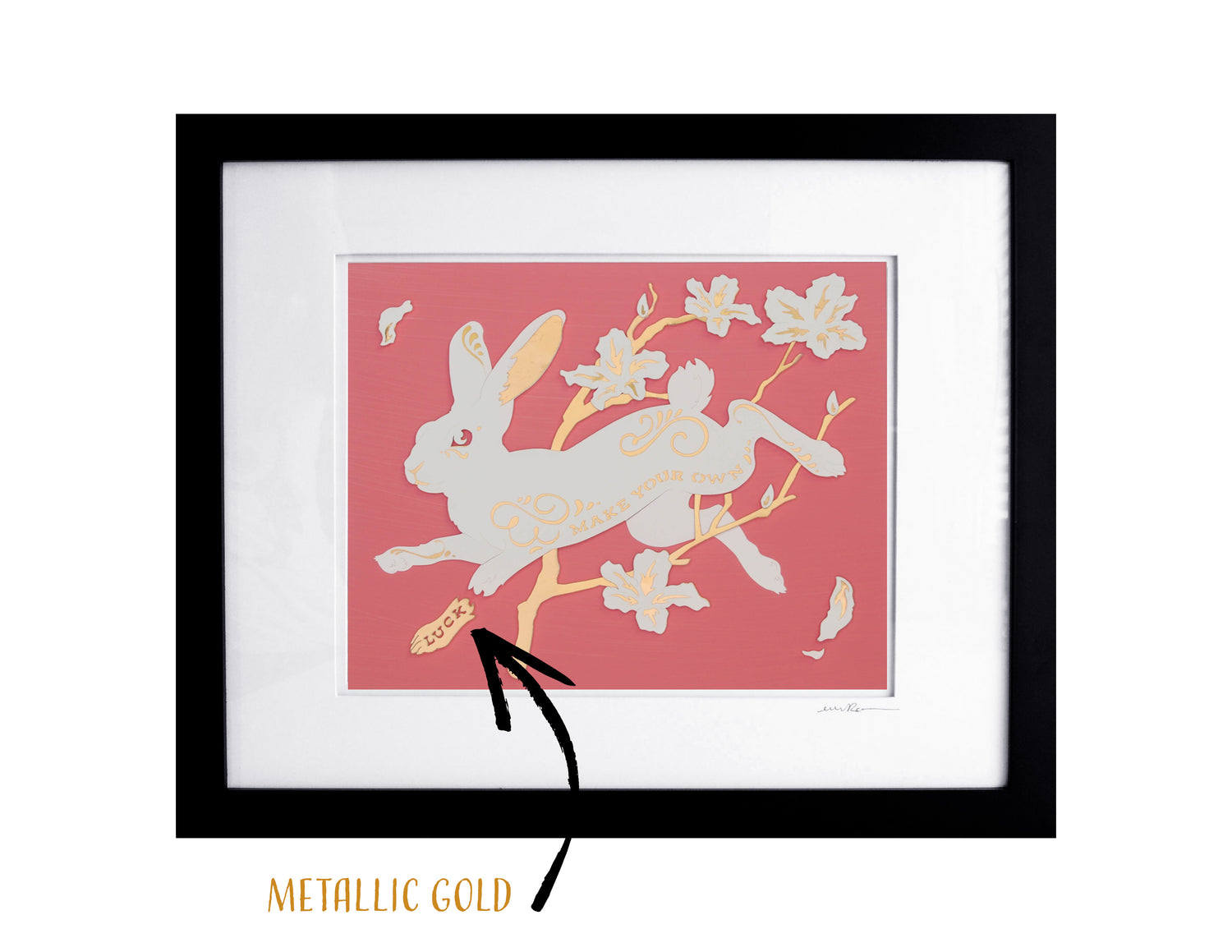 This playful artwork showcases an original papercut of a lucky hare leaping on a soft peachy pink background. Its front foot, rendered in metallic gold with the word "luck" cut out, is ironically detached from the rest of the rabbit’s body, adding a mischievous twist. "Make your own" is cut from the rabbit's body. A gold azalea branch behind the hare brings an extra layer of charm and good fortune to this whimsical piece.