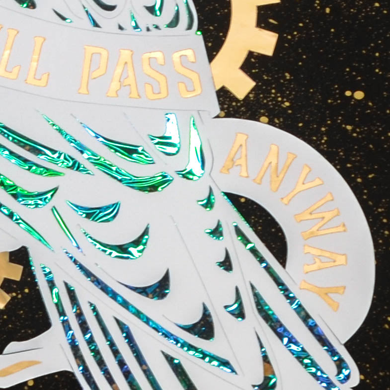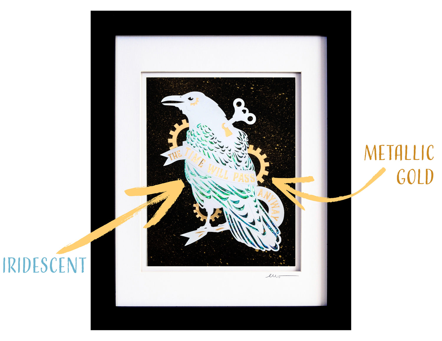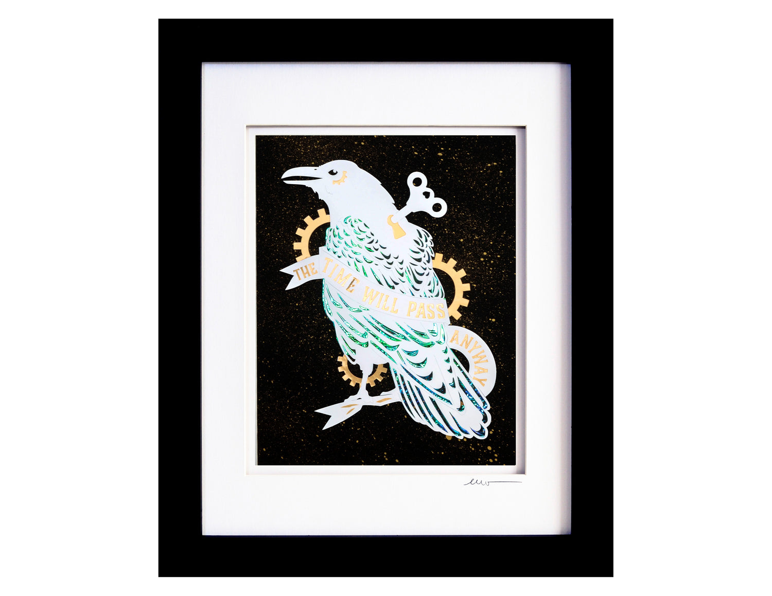 This playful papercut showcases a realistic raven with a wind-up key in its back, surrounded by gleaming metallic gold gears. Its cut-out feathers shimmer with iridescent colors, adding a magical touch. Wrapped around the bird is a lively banner that says, "the time will pass anyway" so you might as well start now, inspiring you to take action with a wink and a smile.