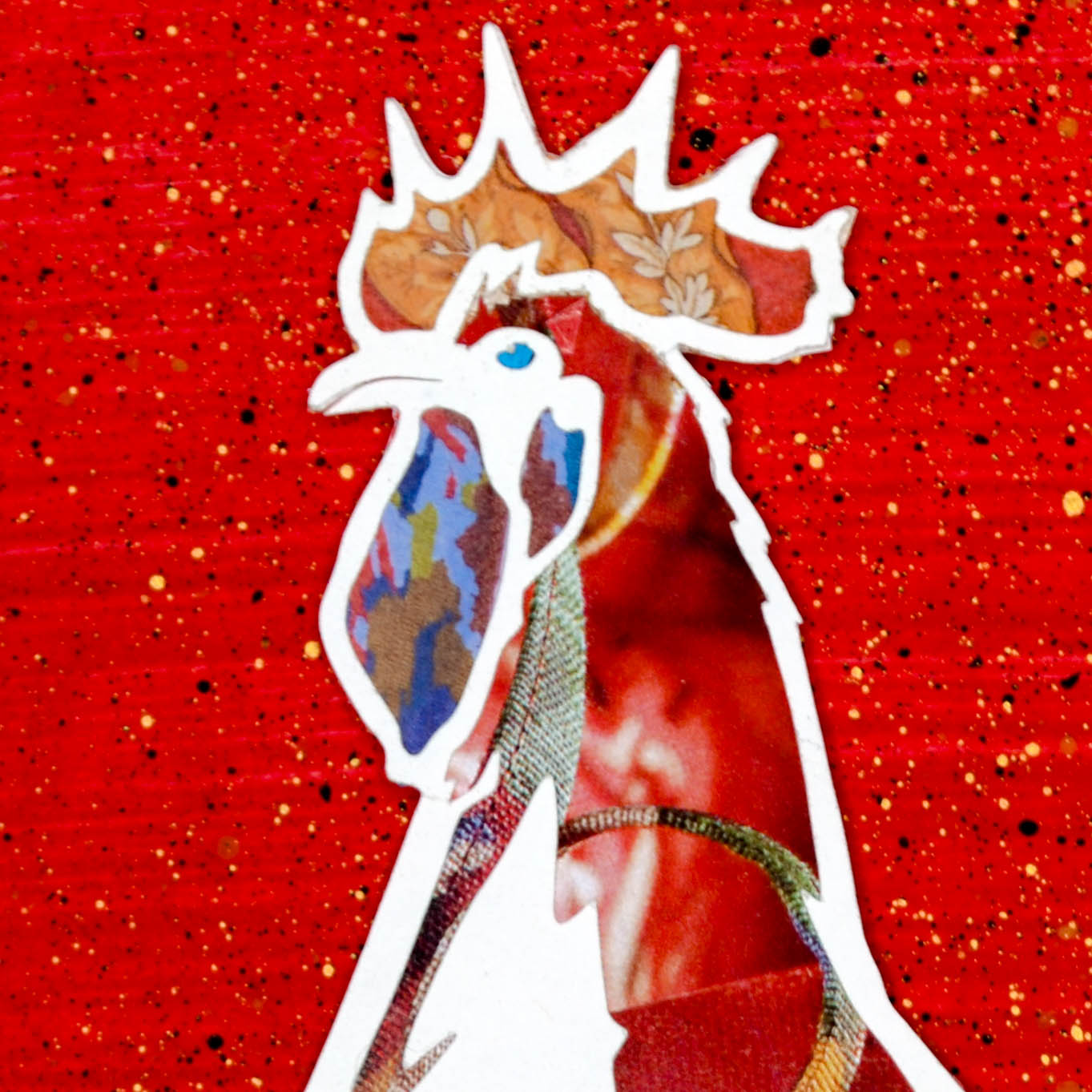 Celebrate whimsy and creativity with this original papercut rooster, set against a vibrant red background. Crafted with playful precision, recycled magazine pages peek through the feathers, adding colorful texture and charm. Standing proudly, this piece brings a lively touch of artful fun to any kitchen or space.